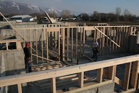 Our new house is coming along nicely (and quickly)! I think the boys have finally agreed on whose room is whose. And, funny that being able to look out their bedroom window and see Jimmy helped settle the disagreement over rooms. It's hard to believe that 35 days ago this was just an empty lot ...