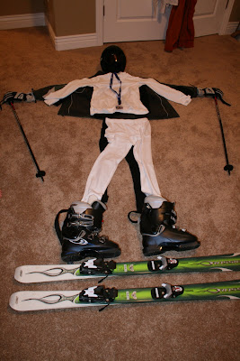 PS ... Every time Emery goes skiiing, he gets all of his clothes and gear ready the night before. Thermals, clothing layers, gloves, hat, helmet, skiis, boots, poles, everything. And for the last few years, he has always laid it all out in his room like this ...